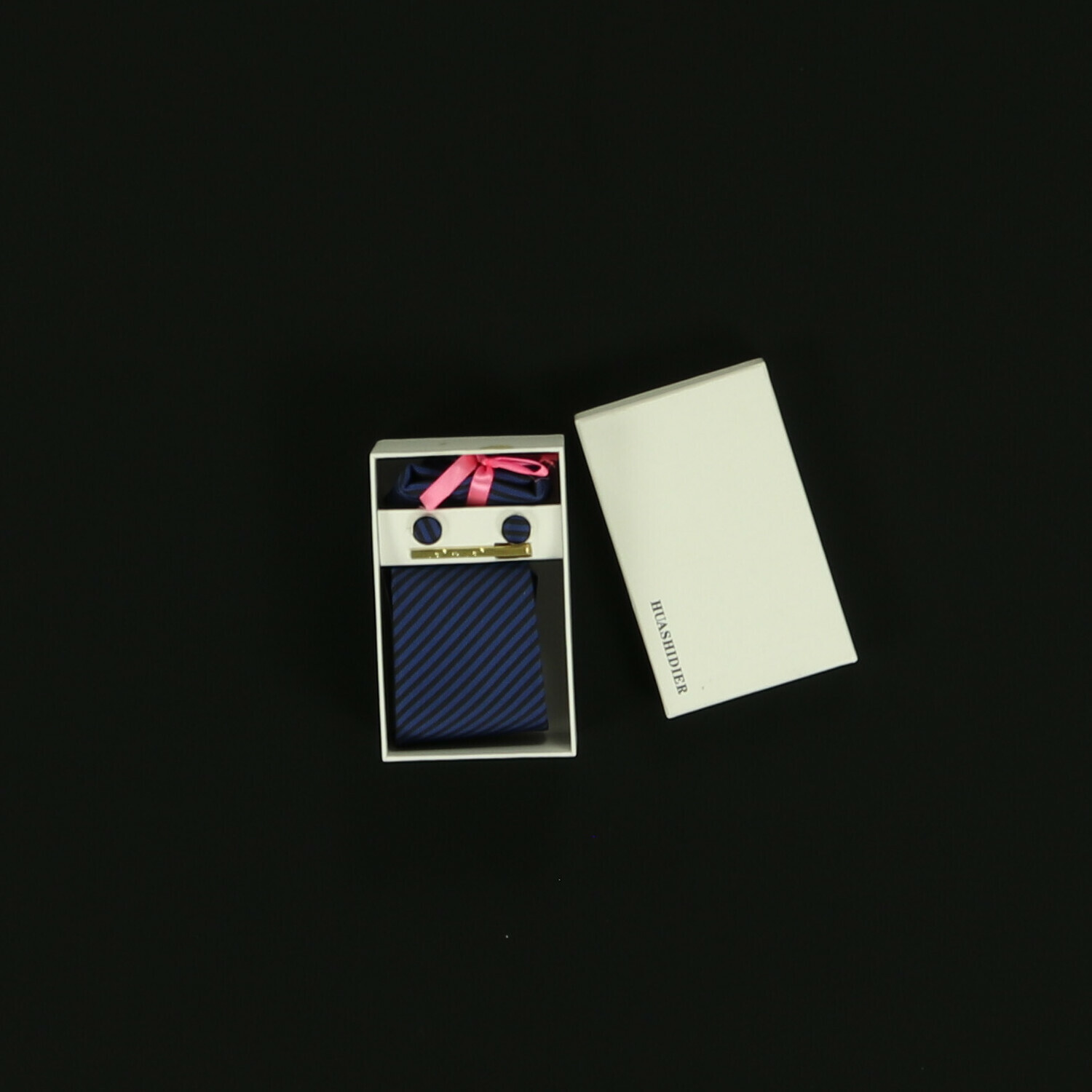 Huashidier kék nyakkendő, dísz zsebkendő, mandzsettagomb, nyakkendő csipesz